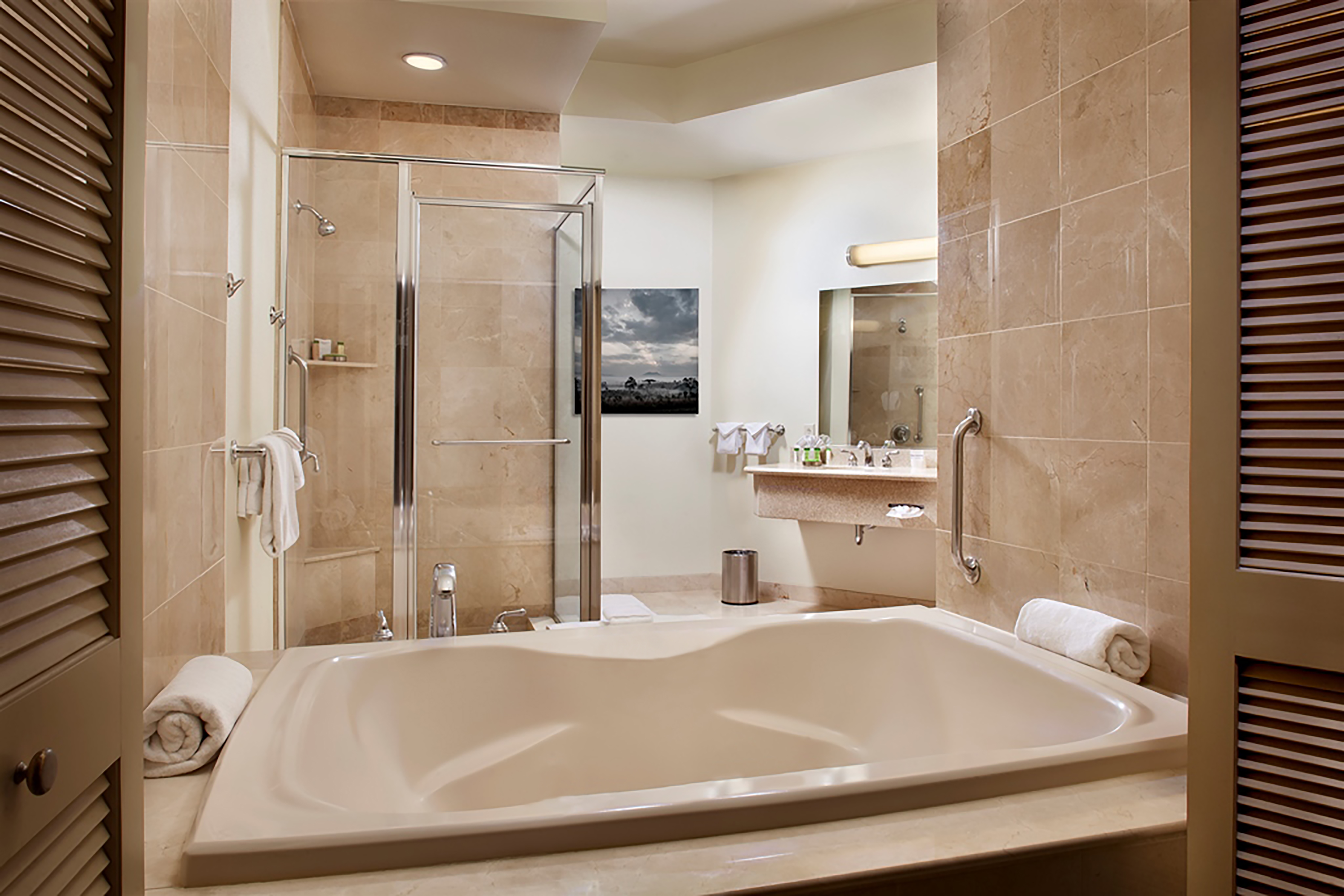 The Tower Suite is 574 square feet with one king bed and one sofa. Designed with couples in mind with a spacious living area that includes a designated work area and a bathroom perfect for two including a Roman tub, separate shower and double vanity.